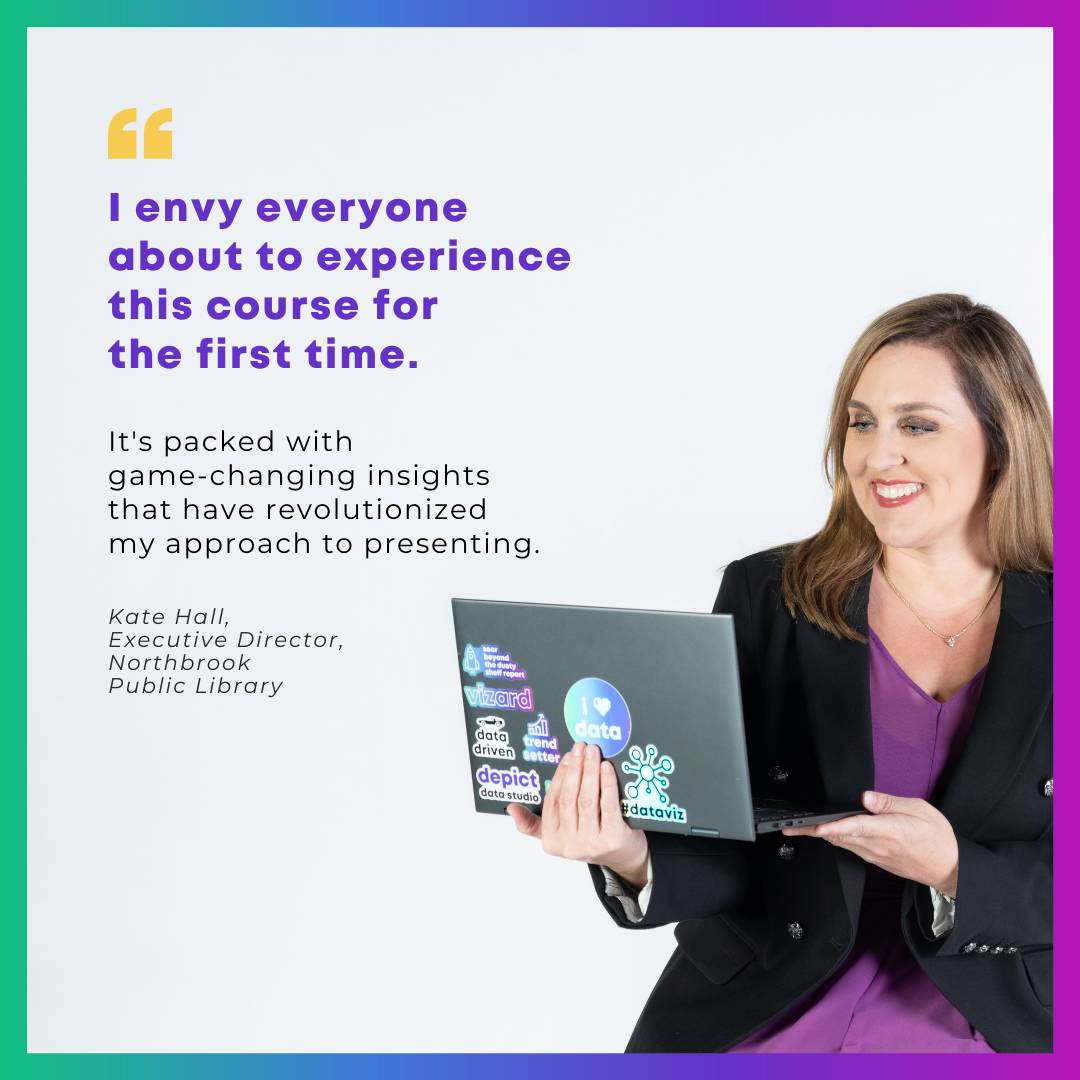 Additional support and materials, like an 80-page ebook with checklists and case studies; private Data Vizards community of fellow participants; captions on all videos; and certificates of completion.