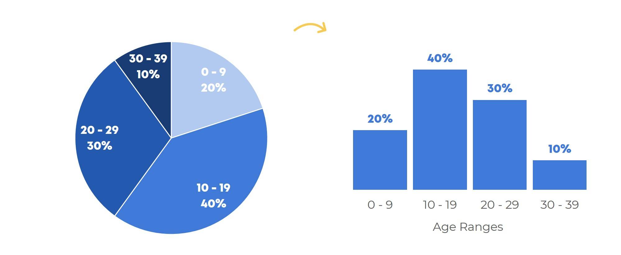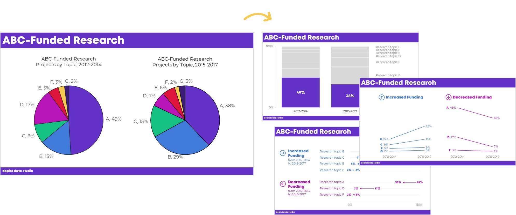 In Let's Revamp a Page of Pie Charts, you'll see ideas for transforming small multiples pies into stacked bars, regular bars, and area charts... and then making them dynamic!