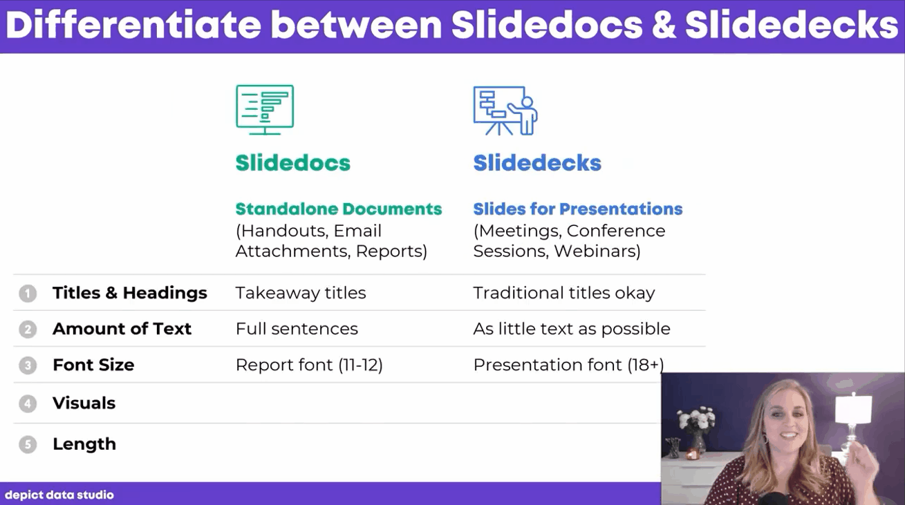 You'll master critical presentation lingo: differentiating between slidedocs (standalone documents) and slidedecks (presentation slides).