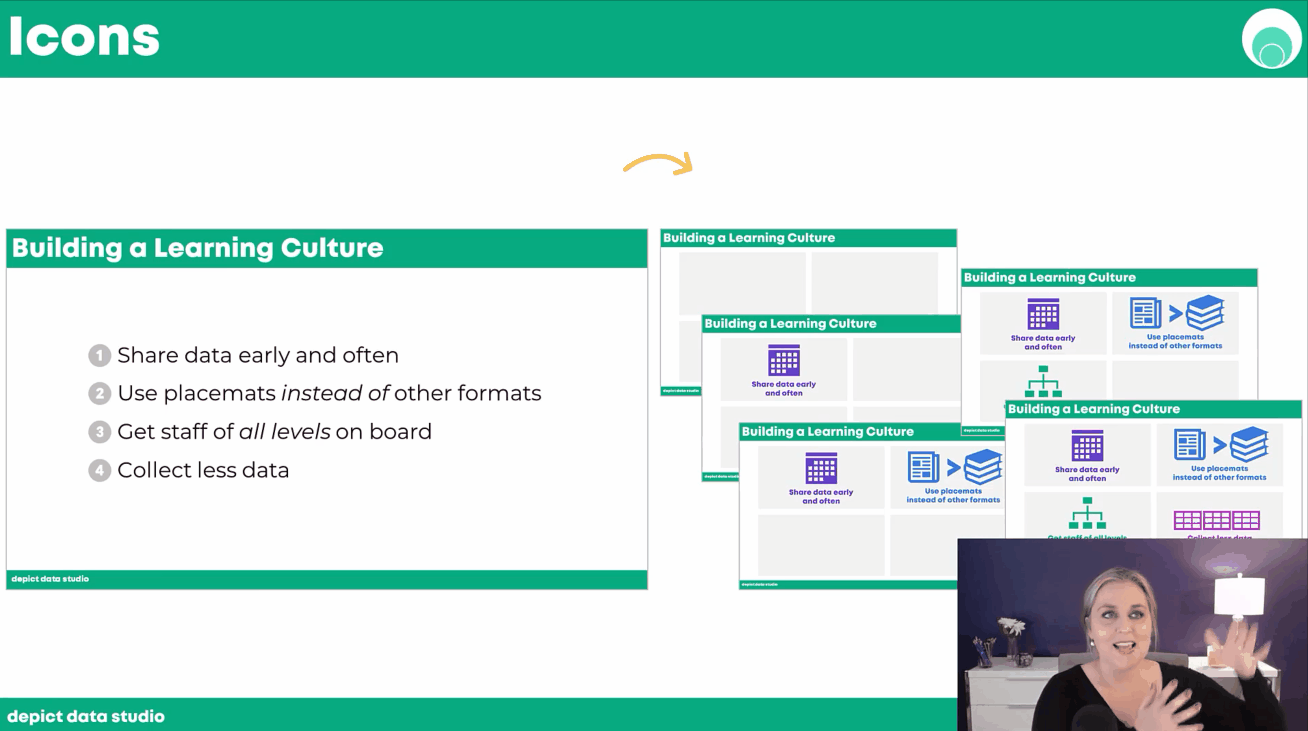 You'll apply your brand colors, fonts, photographs, and icons; you'll create color-coded divider slides; and follow my checklist of 15+ Ideas for visuals to ensure that every slide has a powerful visual.